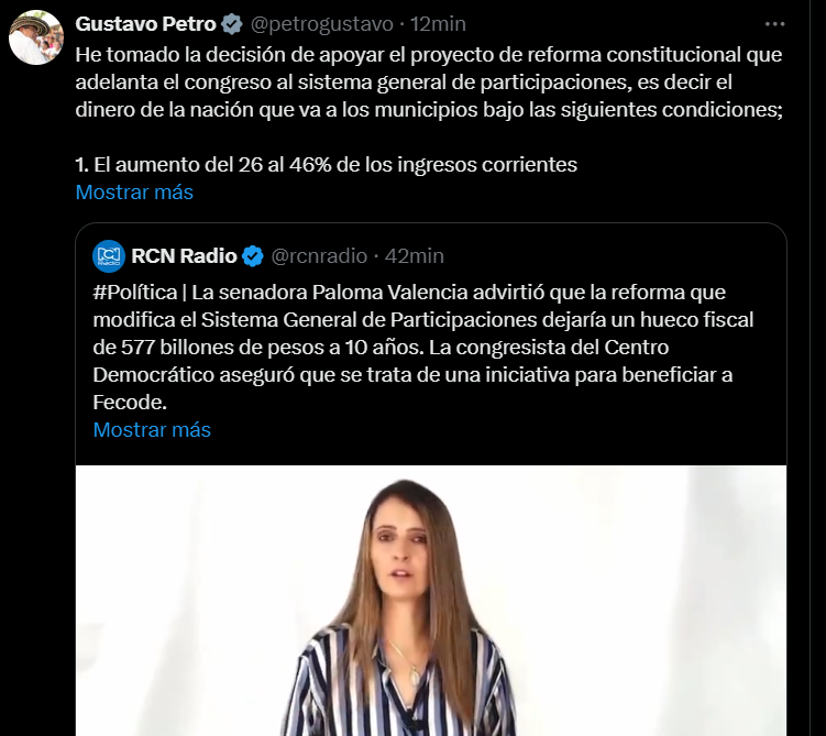 En un mensaje a través de su cuenta en la red social X, el presidente Gustavo Petro manifestó su respaldo al proyecto de reforma constitucional que está siendo discutido en el Congreso para modificar el Sistema General de Participaciones (SGP), es decir, la distribución de recursos nacionales hacia los municipios. El mandatario señaló que su apoyo está condicionado a cinco puntos clave que buscan asegurar una implementación gradual y responsable de la reforma.